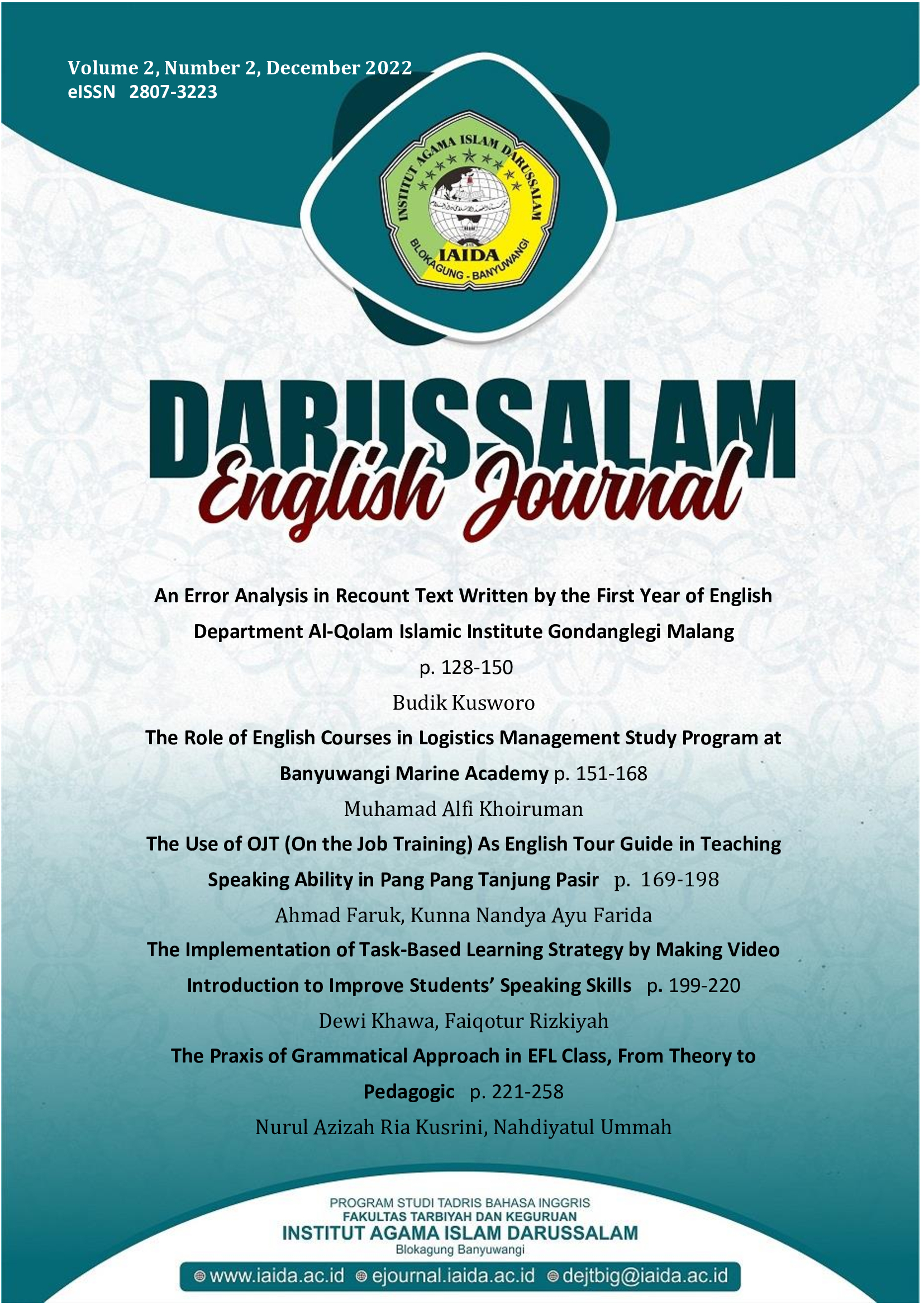 Vol. 2 No. 2 (2022)Darussalam English Journal (DEJ) is a refereed journal published twice a year in June and December by Tadris Bahasa Inggris, Fakultas Tarbiyah dan Keguruan, Institut Agama Islam Darussalam, Blokagung Banyuwangi Indonesia. This journal publishes research articles related to English teaching-learning, literature, and linguistic