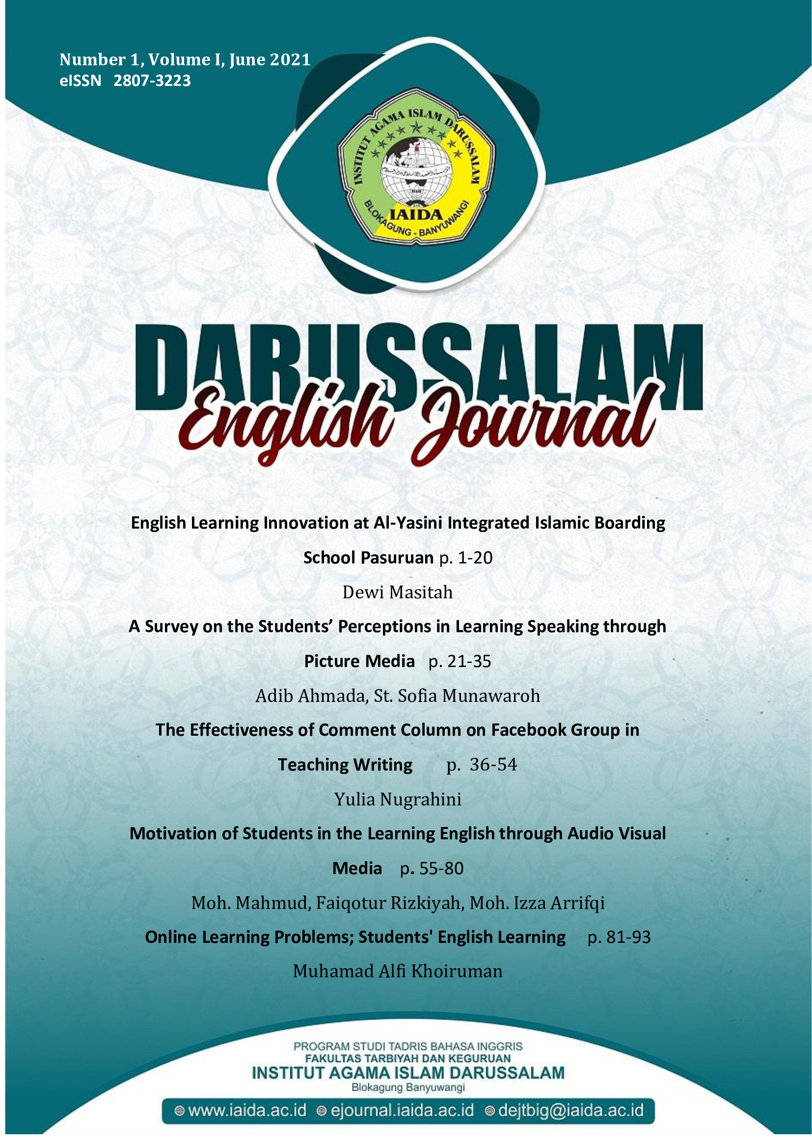 Vol. 1 No. 1 (2021)Darussalam English Journal (DEJ) is a refereed journal published twice a year in June and December by Tadris Bahasa Inggris, Fakultas Tarbiyah dan Keguruan, Institut Agama Islam Darussalam, Blokagung Banyuwangi Indonesia. This journal publishes research articles related to English teaching-learning, literature, and linguistic